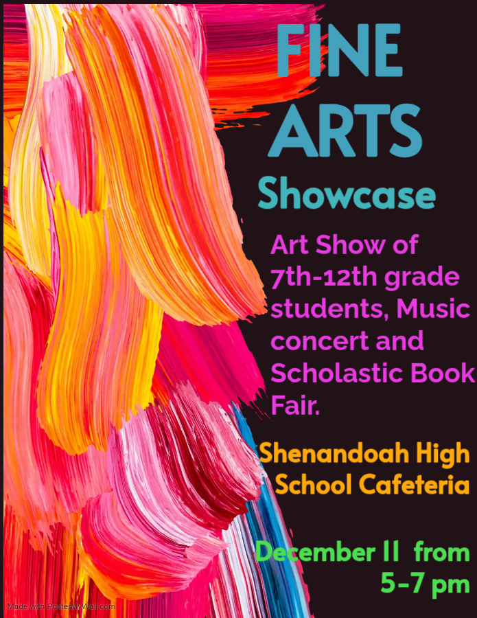 The Fine Arts Showcase will be December 11 from 5-7 pm in the High School. Band will have their performance beginning at 7 pm, all 7th-12th grade students in art this school year will have art on ...